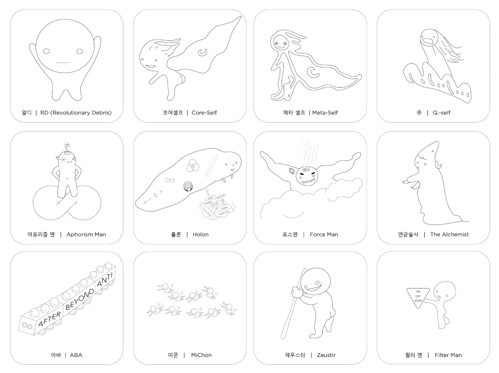 ‘GHUT: 것’ 세상의 차원은 보이지 않는 질서와 에너지가 얽히며 생성과 소멸이 반복되는 역동적 공간이다. 모든 존재가 서로 얽히고 흐르며, 고정된 실체로 머물지않으며, 모든 관계와 상황은 끊임없이 변하고 유동적이다. RD와 친구들은 각각 고유한 성격과 기능을 지니지만, 그 모습은 상황과 관계에 따라 달리 드러나기도 한다.